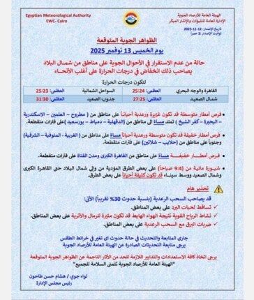 المصدر 24 - كشفتِ الهيئة العامة للأرصاد الجوية عن حالة الطقس اليوم الخميس 13 نوفمبر 2025، موضحةً الظواهر الجوية ودرجات الحرارة المتوقعة في محافظات ومدن مصر.
