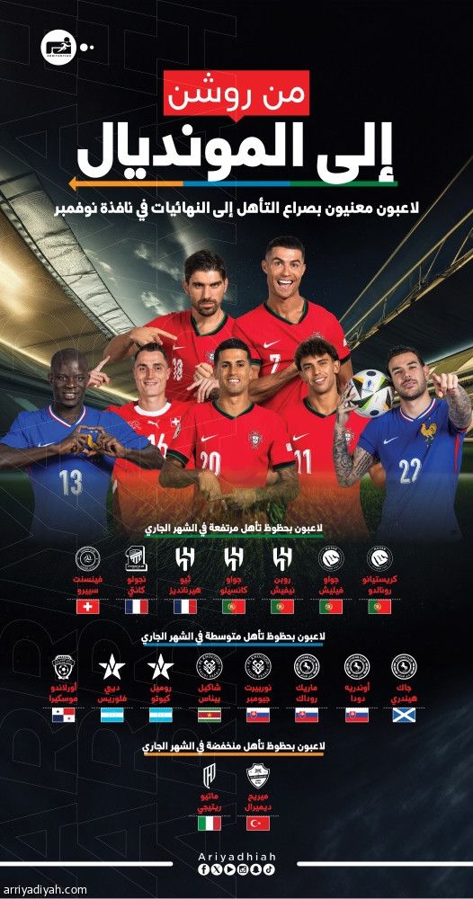 المصدر 24 - تنتظر مجموعة كبيرة من المنتخبات التعرّف على مصيرها في الطريق نحو نهائيات كأس العالم 2026، خلال نافذة نوفمبر الدولية الجارية، لا سيما مع اقتراب مرحلة الحسم في تصفيات القارة الأوروبية، ومنطقة الكونكاكاف، إذ يسعى 17 لاعبًا من الناشطين في أندية دوري روشن السعودي، إلى حجز بطاقات مباشرة إلى المونديال، خلال الشهر الجاري، ولو أن الحظوظ تتفاوت بين لاعب وآخر، وبين منتخب وآخر.