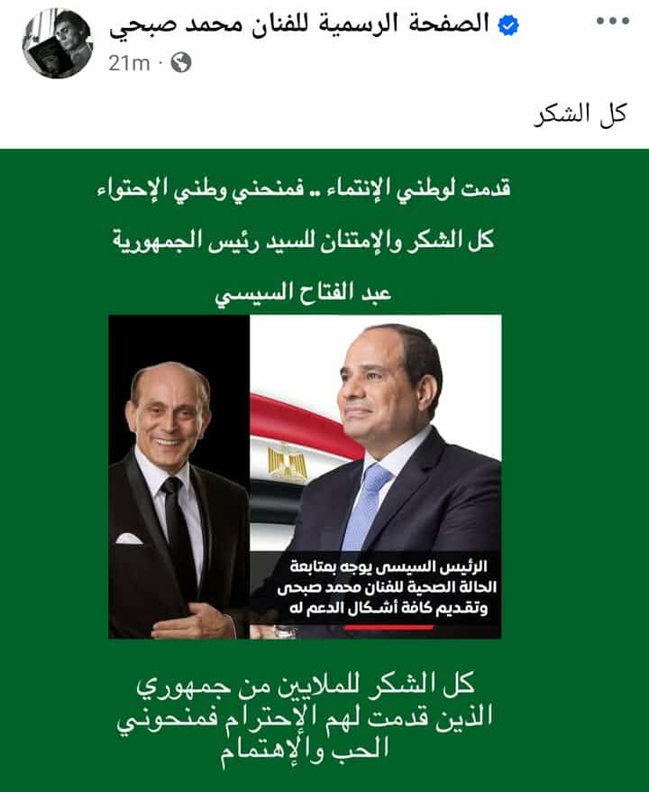 المصدر 24 - حرصت الصحفة الرسمية للفنان محمد صبحي، على توجيه رسالة شكر للرئيس عبد الفتاح السيسي، وذلك بعدما وجه الأخير بمتابعة حالة الفنان الصحية، وصدور تقرير طبي ومتابعة دورية بالحالة، مشيرا إلى أن الوطن قدم له الاحتواء، تقديرا لانتماءه له.