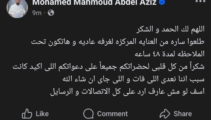 وتأتي هذه التطورات بعد أيام من تعرض زوجة الفنان محمد محمود عبد العزيز لمضاعفات خطيرة إثر ولادة طفلتهما، حيث أصيبت بنزيف داخلي استدعى تدخلًا جراحيًا عاجلًا لإنقاذ حياتها وفي التدوينة نفسها، أكد عبد العزيز على أهمية الدعم الروحي والدعاء، داعيًا الجميع لمواصلة الدعاء لها بالشفاء التام.
