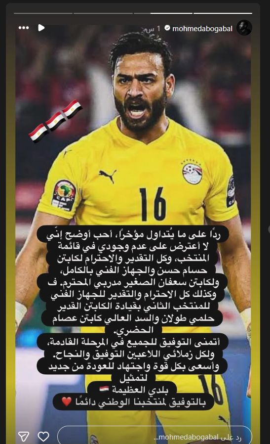 تحيا مصر، وكتب محمد أبو جبل عبر حسابه الرسمي" انستجرام": ردا على ما يُتداول مؤخرا، أحب أوضح إني لا أعترض على عدم وجودي في قائمة المنتخب، وكل التقدير والاحترام لكابتن حسام حسن والجهاز الفني بالكامل، ولكابتن سعفان الصغير مدربي المحترم"ز