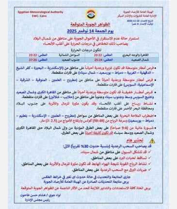 الظواهر الجوية المتوقعة اليوم الجمعة 14 نوفمبر 2025