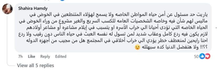 كما أيدت الفنانة شهيرة النداء، وكتبت في تعليق مطوّل: "ياريت حد مسؤول عن أمن حياة المواطن الخاصة ولا يسمح لهؤلاء المسيئيين بالخوض في ما ليس لهم شأن فيه، خاصة الشخصيات العامة التي يتم استغلالها للكسب السريع وغير المشروع.. لا بد يكون فيه ردع كامل وعقاب شديد، نحن نتجه لمنعطف خطر يؤدي إلى خراب أخلاقي في المجتمع، هل من مجيب؟".