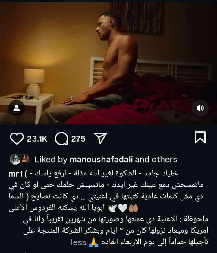 وتابع حديثه: الأغنية دي عملتها من شهرين وصورتها وأنا في امريكا وميعاد نزولها كان من 3 أيام، شكرا للشركة المنتجة أنها أجلت طرحها ليوم الاربعاء القادم حدادا على والدي.