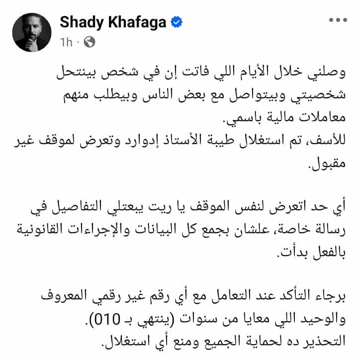 وتابع شادي خفاجة: أي حد اتعرض لنفس الموقف يا ريت يبعتلي التفاصيل في رسالة خاصة، علشان بجمع كل البيانات والإجراءات القانونية بالفعل بدأت، برجاء التأكد عند التعامل مع أي رقم غير رقمي المعروف والوحيد اللي معايا من سنوات (ينتهي بـ 010).. التحذير ده لحماية الجميع ومنع أي استغلال.