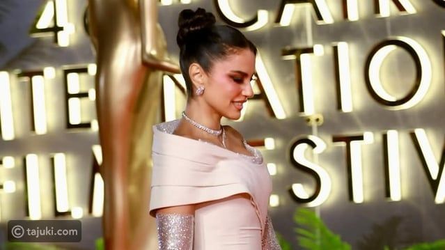 ولعل أكثر عناصر الإطلالة جرأة هي القفازات اللامعة التي ارتدتها درة، والتي جاءت مرصّعة بتأثير معدني برّاق يمتد حتى أعلى الذراعين، ما أضاف عنصرًا دراميًا يوازن بين هدوء اللون العاجي وفخامة التفاصيل. وفي تفاعل مثالي مع الإضاءة المحيطة، عكست القفازات بريقًا قويًا جعل الإطلالة أكثر تميزًا وسط الزخم الذي تشهده السجادة الحمراء.