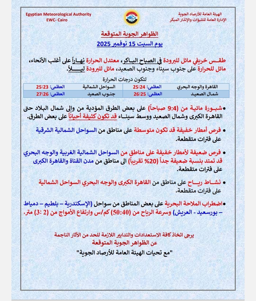 أوضحت الهيئة أن الطقس غدٍا السبت سيكون خريفيًا مائلًا للبرودة خلال ساعات الصباح الباكر، بينما يسود طقس معتدل الحرارة نهارًا على أغلب الأنحاء، ويتحول إلى مائل للحرارة على جنوب سيناء وجنوب الصعيد، على أن يميل للبرودة ليلًا في أغلب المدن والمحافظات.