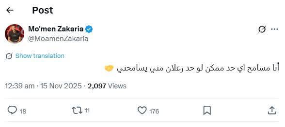 تحيا مصر، وكان وجه مؤمن زكريا نجم النادي الأهلي السابق، رسالة عبر حسابه الرسمي"أكس":" : أنا مسامح أي حد ممكن لو حد زعلان مني يسامحني".