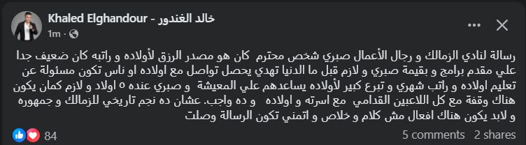 تحيا مصر، وكتب خالد الغندور عبر حسابه الرسمي"فيس بوك": رسالة لنادي الزمالك، ورجال الأعمال صبري شخص محترم كان هو مصدر الرزق لأولاده، و راتبه كان ضعيف جدا علي مقدم برامج و بقيمة صبري".