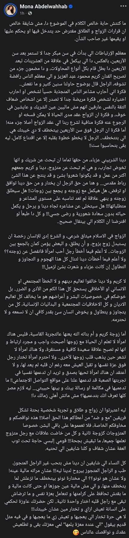 وفي منشورها الذي رصده موقع تحيا مصر عبّرت منى عبد الوهاب عن رفضها لطريقة تناول الجمهور والإعلام لهذه القضية، مؤكدة أن الحياة الشخصية ليست مجالًا للحكم أو التقييم، وقالت عبد الوهاب في بداية حديثها: