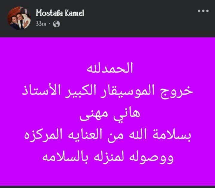وكان قد أعلن الفنان مصطفى كامل، من خلال منشور له عبر حسابه الشخصي على موقع التواصل الاجتماعي فيسبوك، تعرض الموسيقار هاني مهنا، لوعكة صحية، لم يكشف عن تفاصيلها.