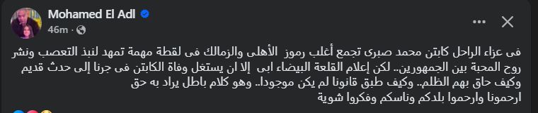 وأختتم قائلاً:" لكن إعلام القلعة البيضاء ابى إلا أن يستغل وفاة الكابتن فى جرنا إلى حدث قديم وكيف حاق بهم الظلم، وكيف طبق قانونا لم يكن موجودا.. وهو كلام باطل يراد به حق، ارحمونا وارحموا بلدكم وناسكم وفكروا شوية".