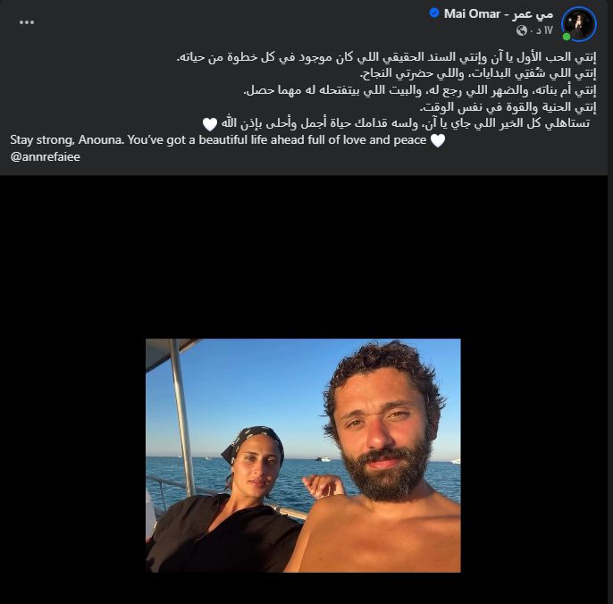 وشاركت الفنانة مي عمر، فيديو به لقطات تجمع بين آن الرفاعي، وزوجها الفنان كريم محمود عبد العزيز، وفقا لما رصده موقع تحيا مصر، وذلك عبر صفحتها الرسمية على موقع التواصل الاجتماعي فيسبوك، وعلقت عليه: إنتي الحب الأول يا آن وإنتي السند الحقيقي اللي كان، موجود في كل خطوة من حياته، إنتي اللي شُفتِي البدايات، واللي حضرتي النجاح، إنتي أم بناته، والضهر اللي رجع له، والبيت اللي بيتفتحله له مهما حصل، إنتي الحنية والقوة في نفس الوقت، تستاهلي كل الخير اللي جاي يا آن، ولسخ قدامك حياة أجمل وأحلى بإذن الله.