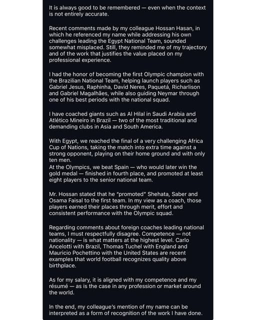 وكتب روجيرو ميكالي في رسالته لحسام حسن، من الجيد دائماً أن يتذكرك الآخرون حتى وإن لم تكن السياقات دقيقة تماماً، والتصريحات الأخيرة التي أدلى بها زميلي حسام حسن، والتي أشار فيها إلى اسمي أثناء حديثه عن التحديات التي يواجهها في قيادة المنتخب المصري، بدت لي في غير محلها.