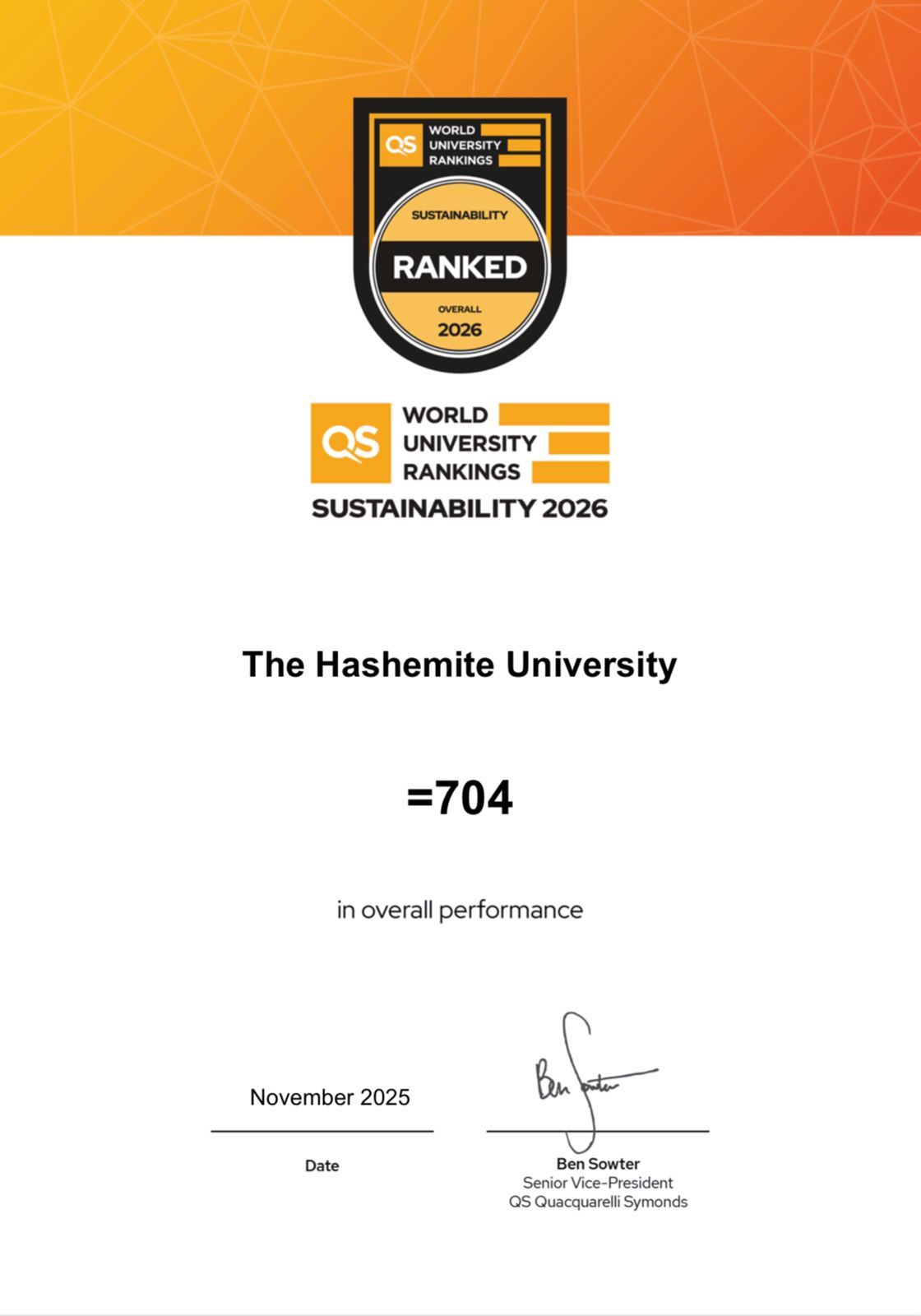 في إنجاز أكاديمي نوعي يعكس التزامًا مؤسسيًا راسخًا، حققت الجامعة الهاشمية قفزة في تصنيف QS العالمي للاستدامة لعام 2026، متقدمة 164 مرتبة عالميًا عن ترتيبها في العام السابق لتصل إلى المركز 704 عالميًا والثالث محليًا.