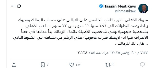 حسن المستكاوى الناقد الرياضى وعبر صفحته على منصة إكس كتب معلقاً :