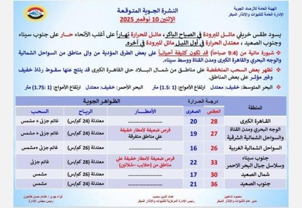 المصدر 24 - كشفتِ الهيئة العامة للأرصاد الجوية عن حالة الطقس اليوم الإثنين 10 نوفمبر 2025، موضحةً الظواهر الجوية ودرجات الحرارة المتوقعة في محافظات ومدن مصر.