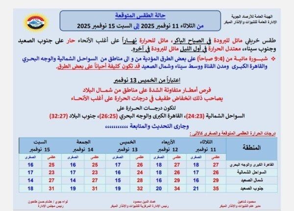 حالة الطقس المتوقعة من الثلاثاء 11 نوفمبر وحتى السبت 15 نوفمبر 2025