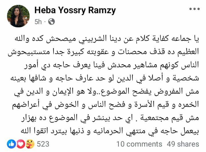 وكتب هبة يسري في منشور رصده موقع تحيا مصر على حسابها الرسمي بموقع التواصل الاجتماعي فيسبوك: يا جماعه كفاية كلام عن دينا الشربيني ميصحش كدة،والله العظيم ده قذف محصنات و عقوبته كبيرة جدا.. متستبيحوش الناس كونهم مشاهير محدش فينا يعرف حاجه دي أمور شخصية و أصلا في الدين لو حد عارف حاجه و شافها بعينه مش المفروض يفضح الموضوع.