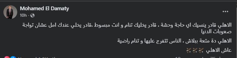 تحيا مصر، وكتب محمد الدماطي عبر حسابه الرسمي"فيس بوك": الأهلي قادر ينسيك أي حاجة وحشة، قادر يخليك تنام وأنت مبسوط ،قادر يخلي عندك أمل عشان تواجة صعوبات الدنيا".