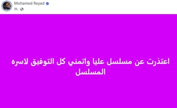 المصدر 24 - أعلن الفنان محمد رياض، اعتذاره عن المشاركة بمسلسل «عاليا» من بطولة الفنانة غادة عبد الرازق خلال الساعات القليلة الماضية، والمقرر عرضه ضمن أعمال الموسم الدرامي لمسلسلات رمضان 2026.