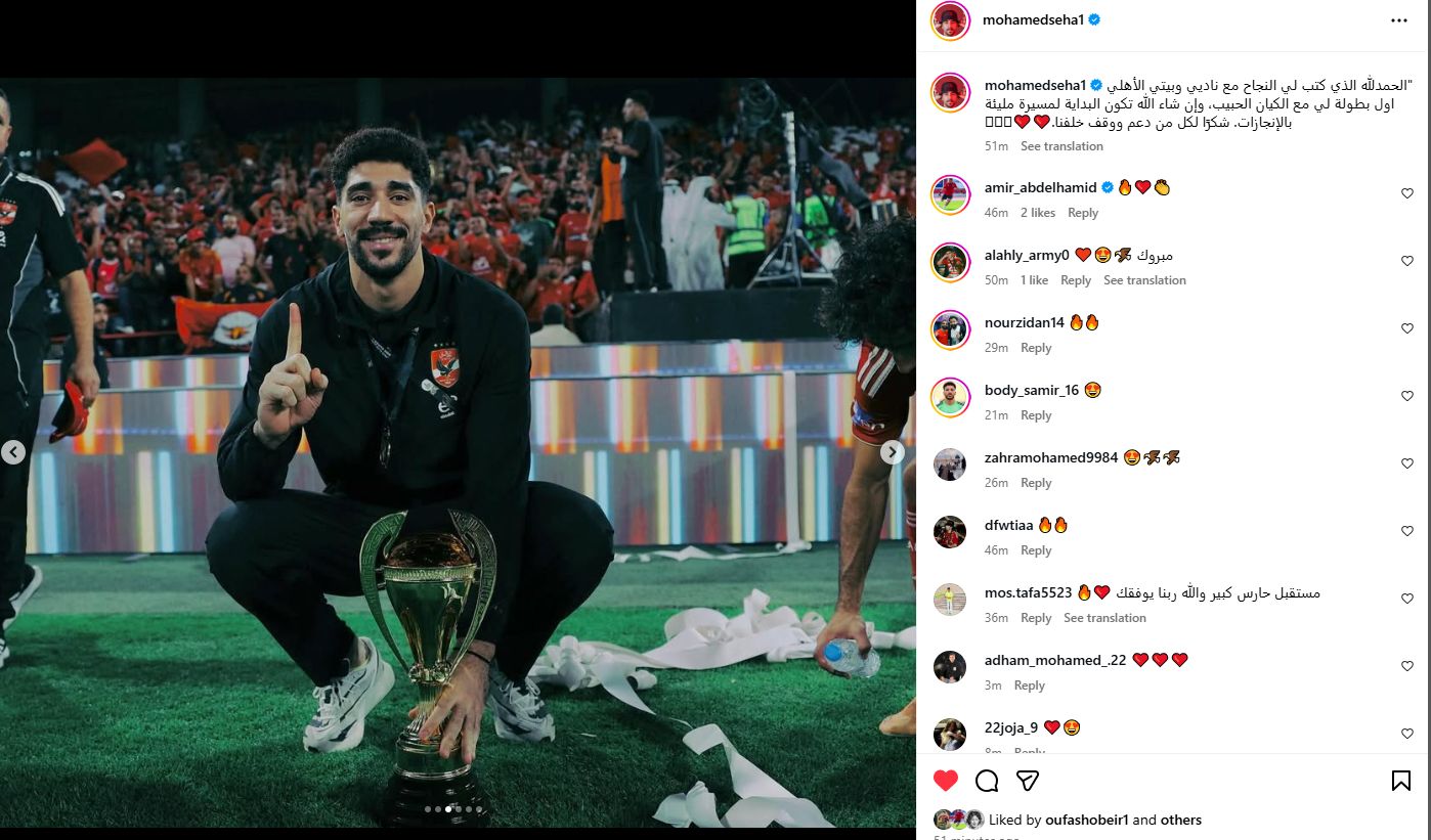 تحيا مصر، وكتب محمد سيحا عبر حسابه الرسمي"انستجرام": الحمدلله الذي كتب لي النجاح مع ناديي وبيتي الأهلي اول بطولة لي مع الكيان الحبيب، وإن شاء الله تكون البداية لمسيرة مليئة بالإنجازات شكرًا لكل من دعم ووقف خلفناً".