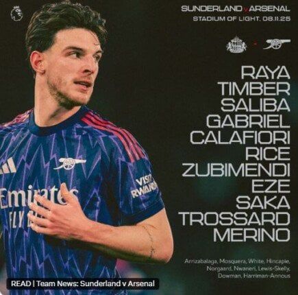 أعلن مايكل أرتيتا المدرب الفني لفريق أرسنال، عن التشكيل الرسمي للفريق، وذلك لمواجهة سندرلاند، اليوم السبت، وذلك في إطار الجولة الحادية عشر من الدوري الإنجليزي الممتاز على ملعب النور.