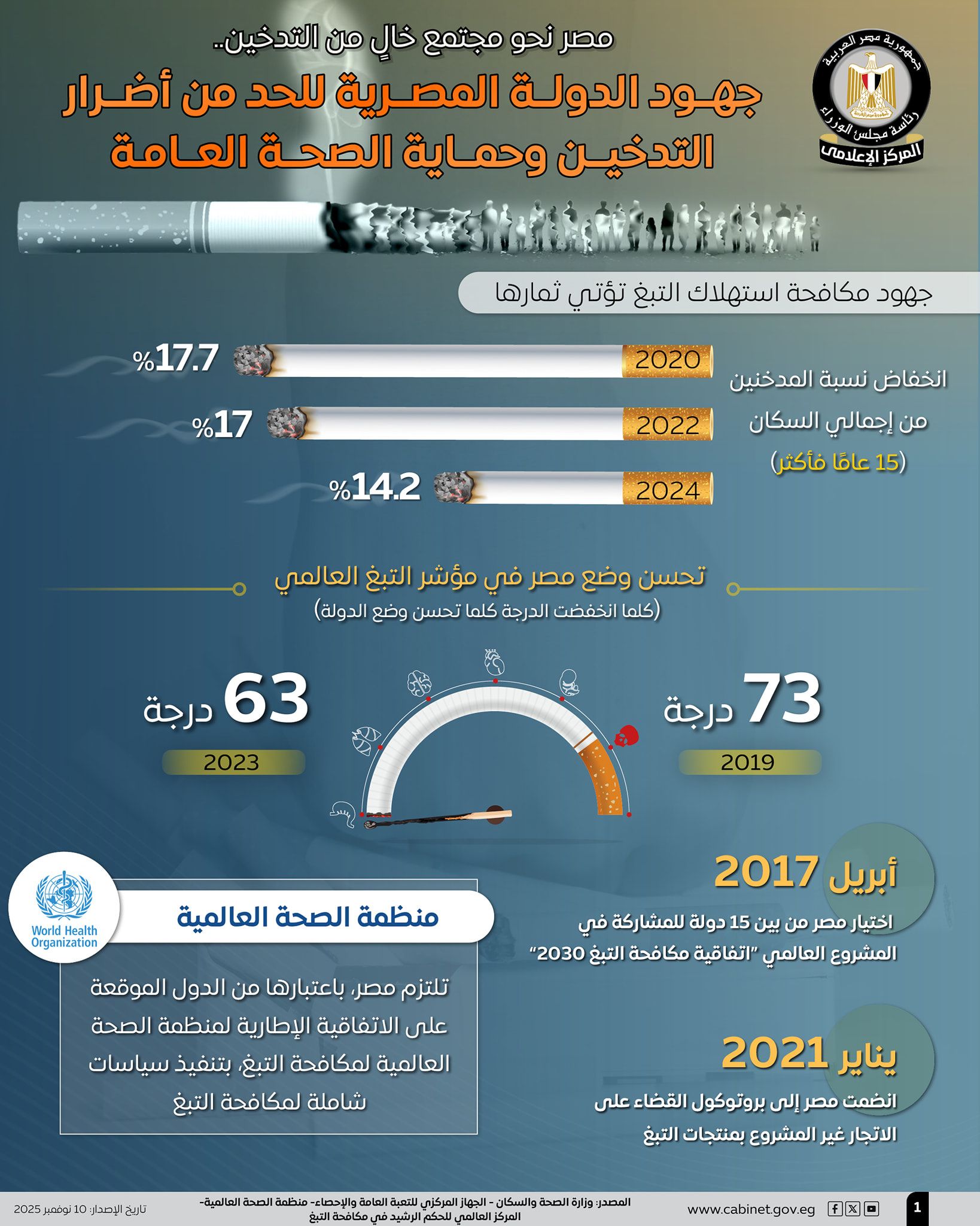 وأشارت الإنفوجرافات إلى جهود مكافحة استهلاك التبغ، والتي أسفرت عن انخفاض نسبة المدخنين من إجمالي السكان "من 15 عامًا فأكثر"، لتصل إلى 14.2% عام 2024، مقارنة بـ 17% عام 2022، و17.7% عام 2020، فضلًا عن تحسن وضع مصر في مؤشر التبغ العالمي بعدما انخفض لـ 63 درجة عام 2023، مقارنة بـ 73 درجة عام 2019.