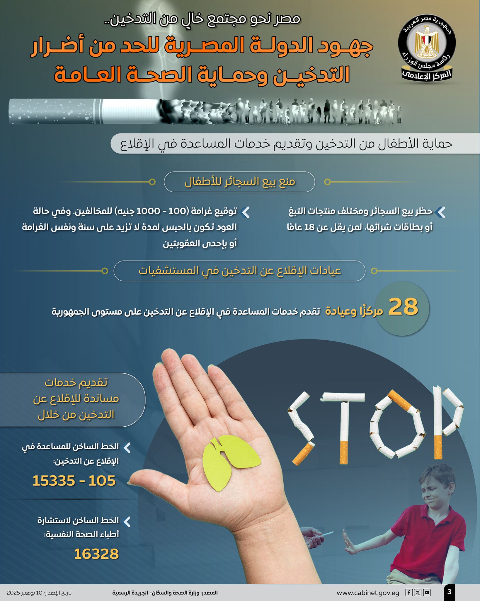 كما يتم تقديم خدمات مساندة للإقلاع عن التدخين من خلال الخط الساخن "105" و"15335"، فضلًا عن تقديم خدمة استشارة أطباء الصحة النفسية عبر الخط الساخن "16328"، إلى جانب توفير نحو 28 مركزًا وعيادة بالمستشفيات على مستوى الجمهورية، لتقديم المساعدة في الإقلاع عن التدخين.