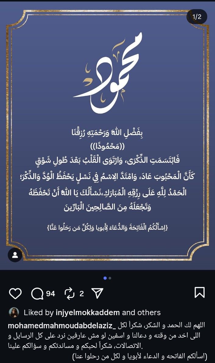 المصدر 24 - أعلن الفنان محمد محمود عبد العزيز عن استقبال مولوده الأول، الذي أطلق عليه اسم والده الراحل محمود عبد العزيز، تخليدًا لذكراه مما يوضح شدة تعلقه وحبه له.