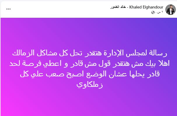 رسالة لمجلس الإدارة : هتقدر تحل كل مشاكل الزمالك؟ إذا أهلاً بك، وإذا مش هتقدر، قول ‘مش قادر’ وأعط الفرصة لمن يستطيع، لأن الوضع أصبح صعباً على كل زملكاوي.