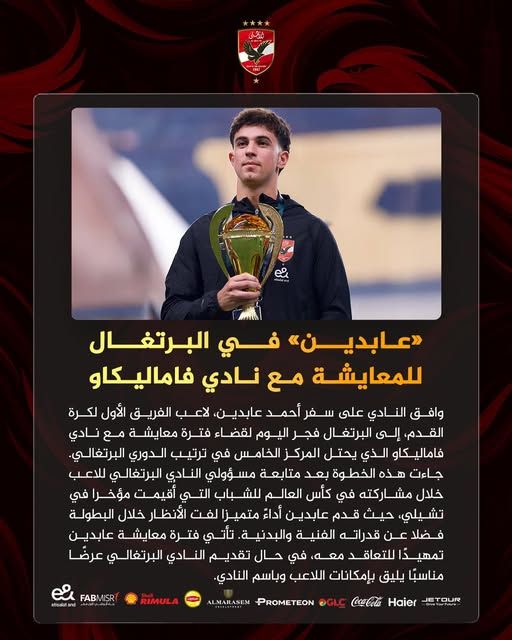 المصدر 24 - وافق النادي الأهلي على سفر أحمد عابدين، لاعب الفريق الأول لكرة القدم، إلى البرتغال فجر اليوم لقضاء فترة معايشة مع نادي فاماليكاو الذي يحتل المركز الخامس في ترتيب الدوري البرتغالي.