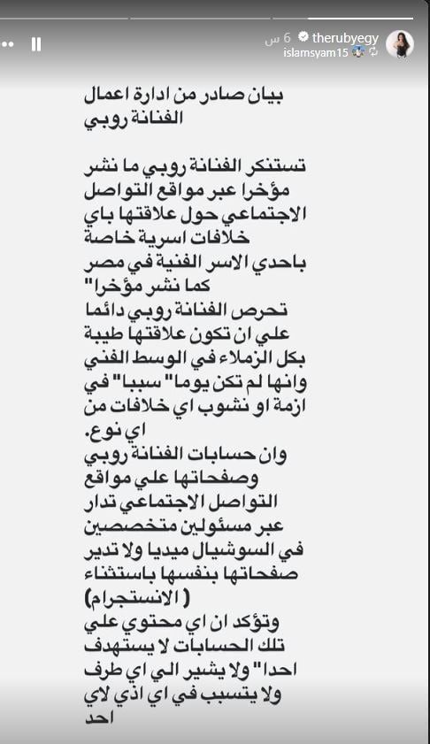 من ناحيته، استنكر إسلام صيام، مدير أعمال روبي، هذه الشائعات عبر بيان رسمي نشره على "ستوري" إنستغرام، مؤكداً أن الفنانة لا علاقة لها بأي خلافات أسرية بين الفنانين، وأنها تحرص دائماً على علاقات طيبة مع زملائها في الوسط الفني، ولم تكن طرفاً في أي نزاع.