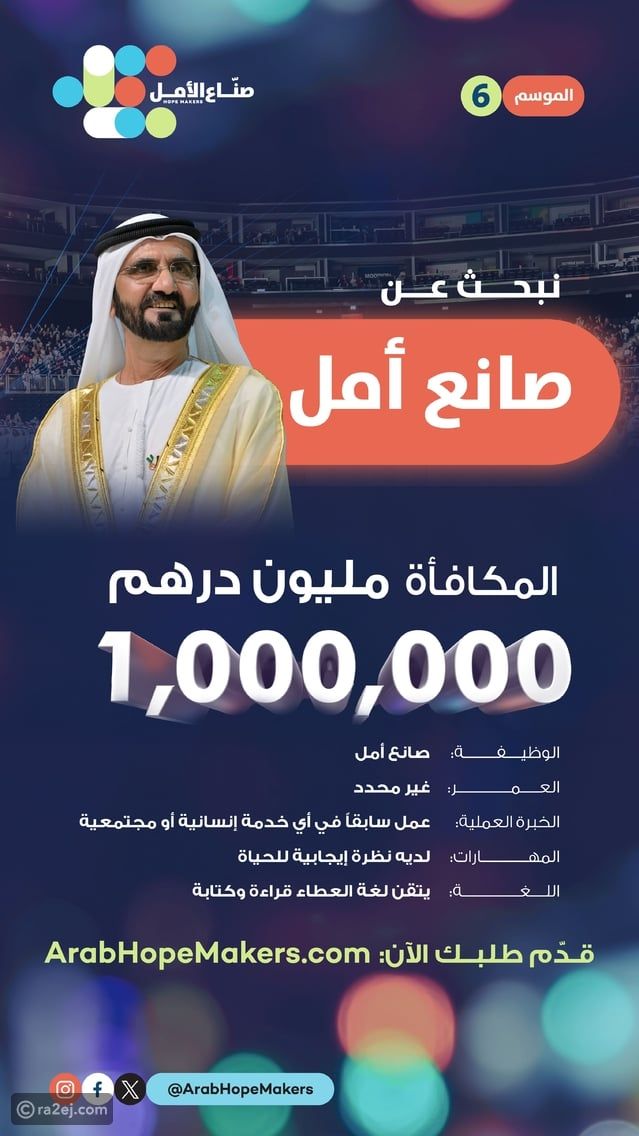 المصدر 24 - أطلق صاحب السمو الشيخ محمد بن راشد آل مكتوم، نائب رئيس الدولة رئيس مجلس الوزراء، حاكم دبي، رعاه الله، الدورة السادسة من "صناع الأمل"، المبادرة العربية الأكبر من نوعها المخصصة للاحتفاء بأصحاب العطاء في الوطن العربي، وذلك عبر تكريم مبادراتهم ومشاريعهم وبرامجهم وحملاتهم الإنسانية والخيرية والمجتمعية التي يسعون من خلالها إلى الارتقاء بمجتمعاتهم، وتحسين نوعية الحياة في بيئاتهم ومساعدة المحتاجين وإغاثة المنكوبين، ورفع المعاناة عن الفئات الضعيفة وإحداث فرق إيجابي في حياة الناس من حولهم، وتسخير مواردهم وإمكاناتهم من أجل الصالح العام أو خدمة شريحة مجتمعية بعينها.