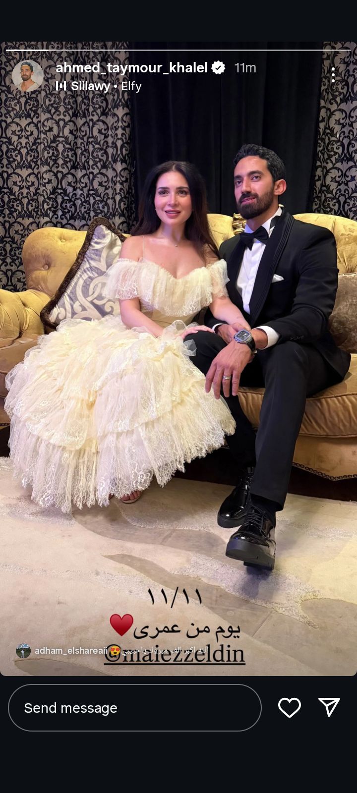 وفي أول تعليق من أحمد تيمور على زواجه من مي عز الدين، قال في منشور رصده موقع تحيا مصر على حسابه الرسمي بموقع تبادل الصور والفيديوهات انستجرام: "11/11.. يوم من عمري"، ليتفاعل معه الجمهور بشكل كبير جدا على مواقع التواصل الاجتماعي المختلفة.