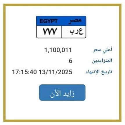 المصدر 24 - أعلنت بوابة مرور مصر الإلكترونية، المزايدة على لوحة معدنية مميزة للسيارات، وصل سعرها إلى مليون و100 ألف جنيه، وتحمل رقم «ع ر ب 777»، ويتزايد عليها حتى الآن 6 أشخاص، ومن المقرر أن تنتهي المزايدة عليها غدا الخميس الموافق 13 نوفمبر 2025.