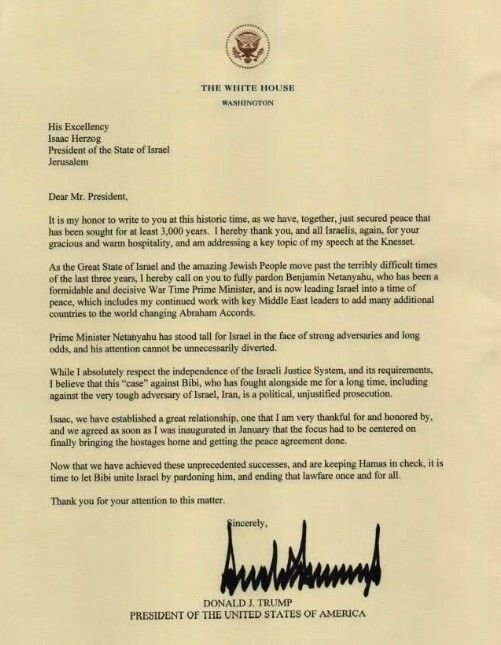 المصدر 24 - أعلن الرئيس الإسرائيلي إسحاق هرتسوغ أنه تلقى رسالة من الأمريكي الرئيس دونالد ترامب، يطالب فيها منح العفو لرئيس الوزراء بنيامين نتنياهو المتهم في العديد من قضايا تتعلق بالفساد والرشوة، واصفاً هذه المحاكمة أنها لأغراض سياسية موجهة ضد صديقه "بيبي".